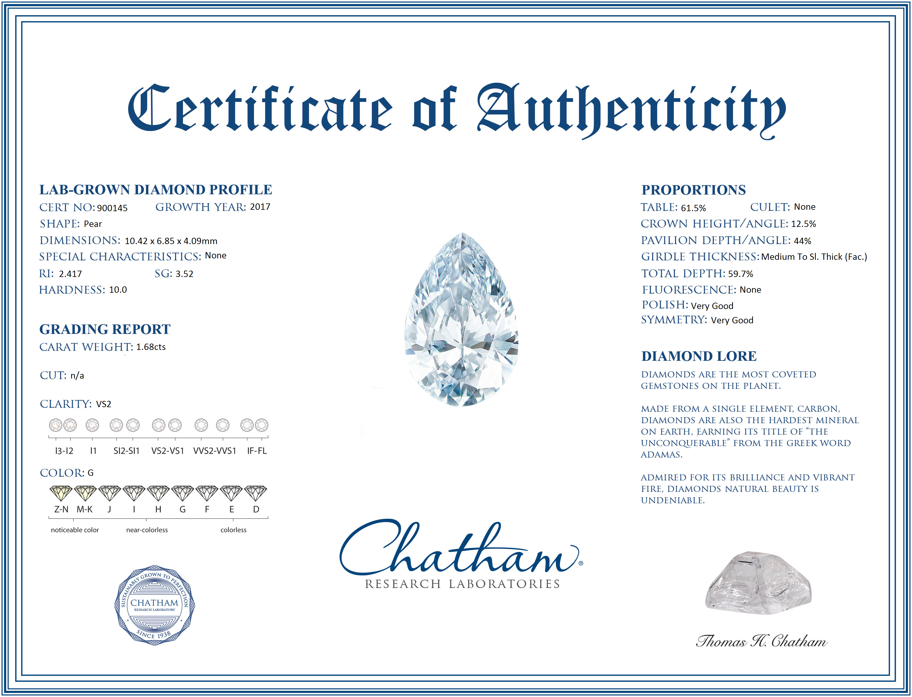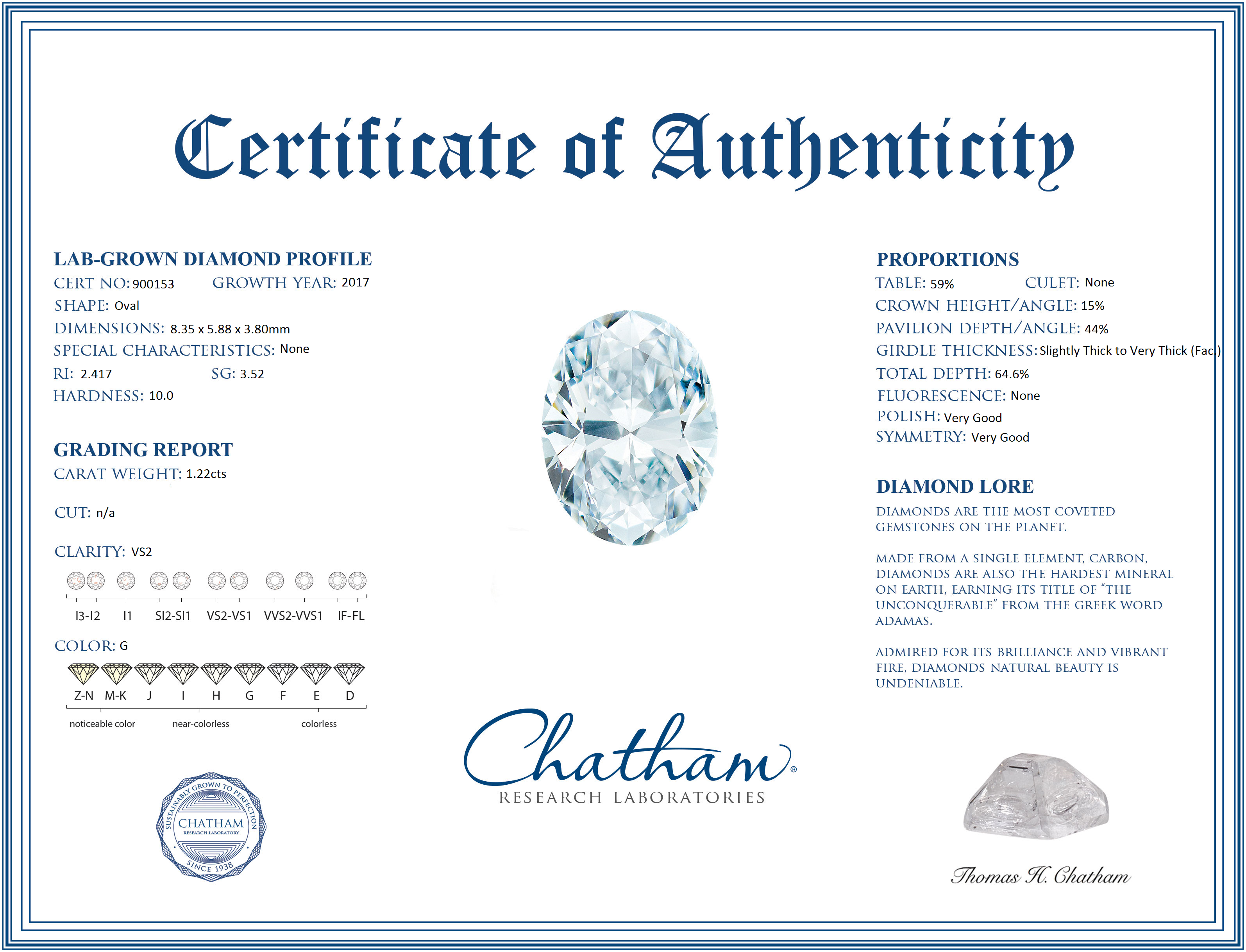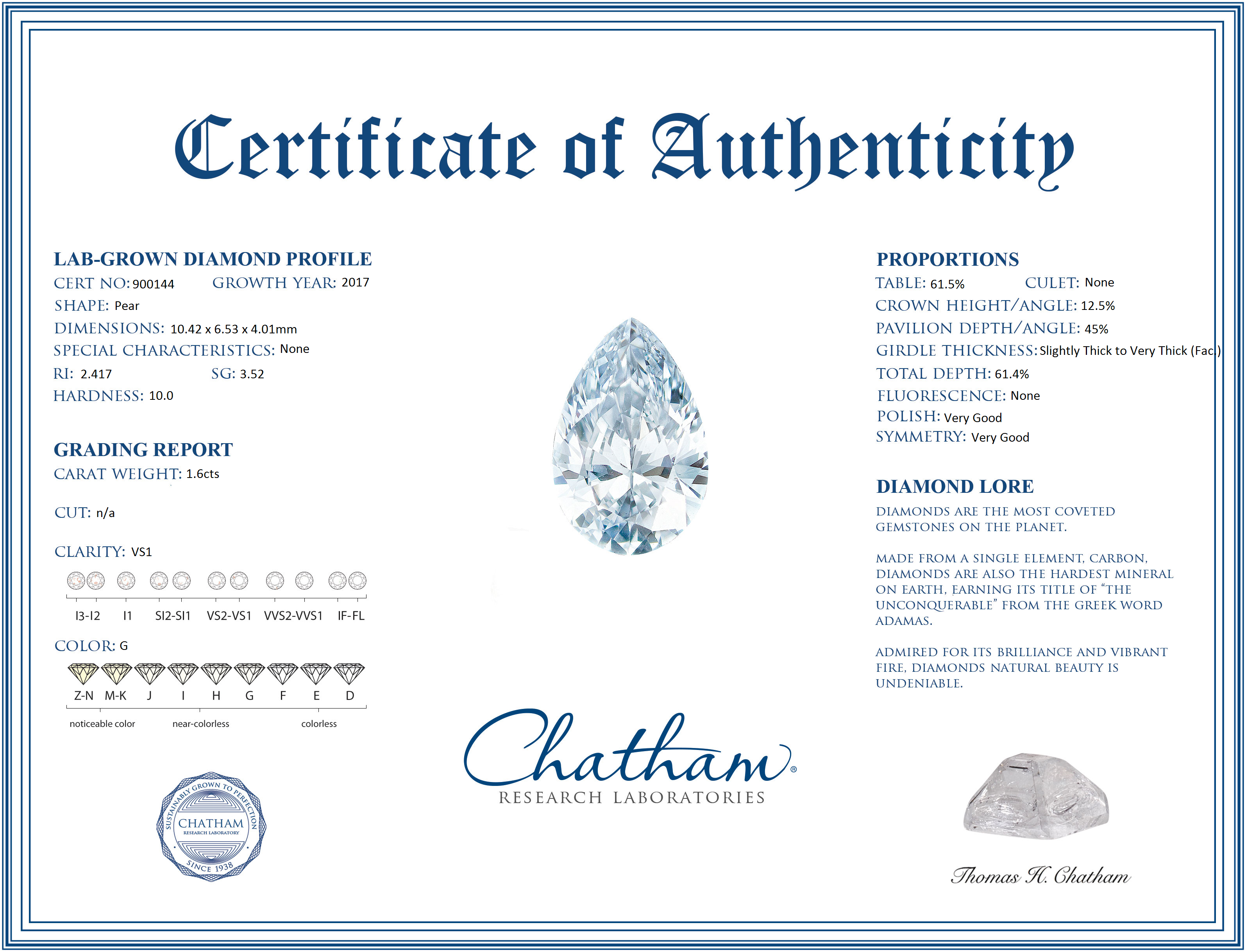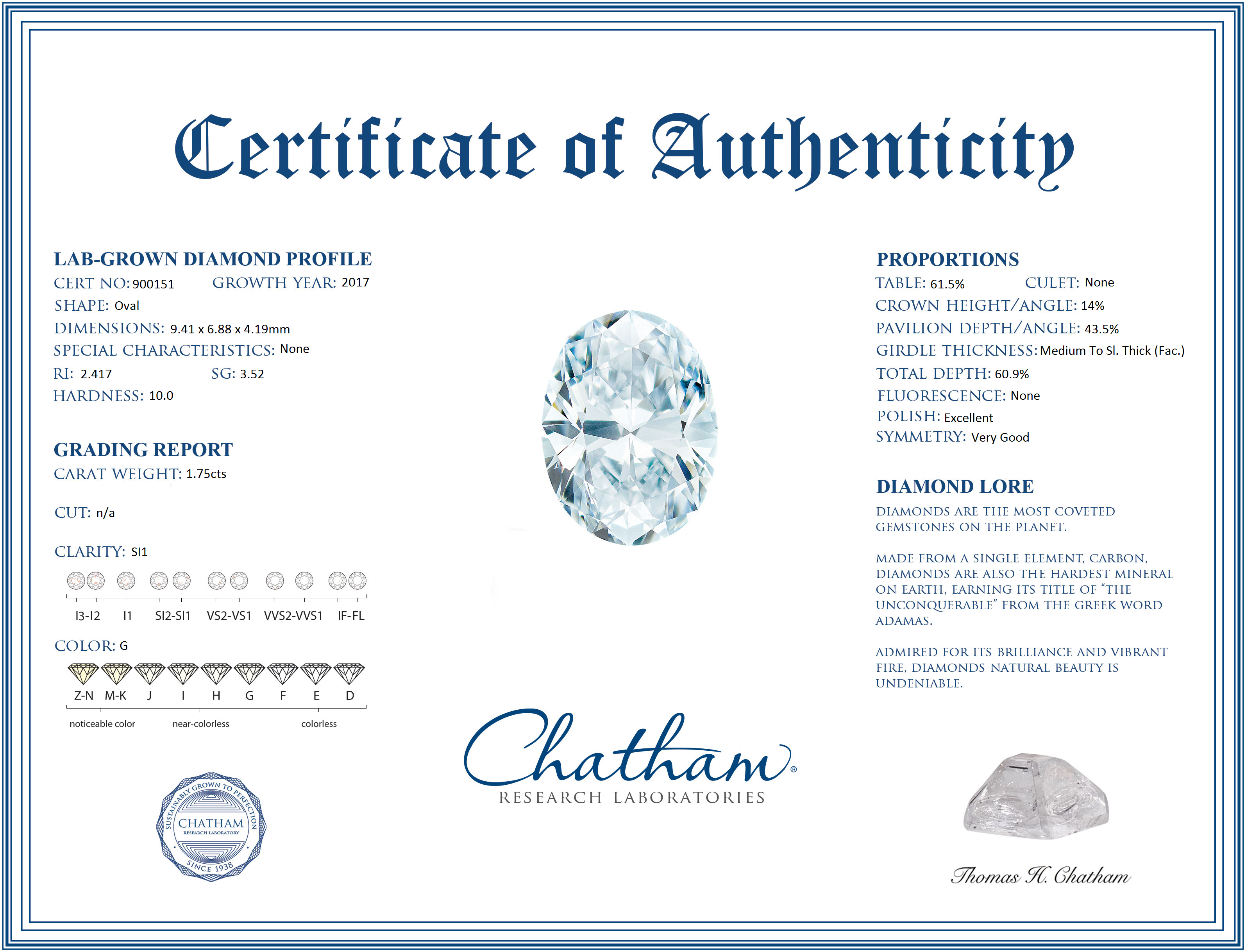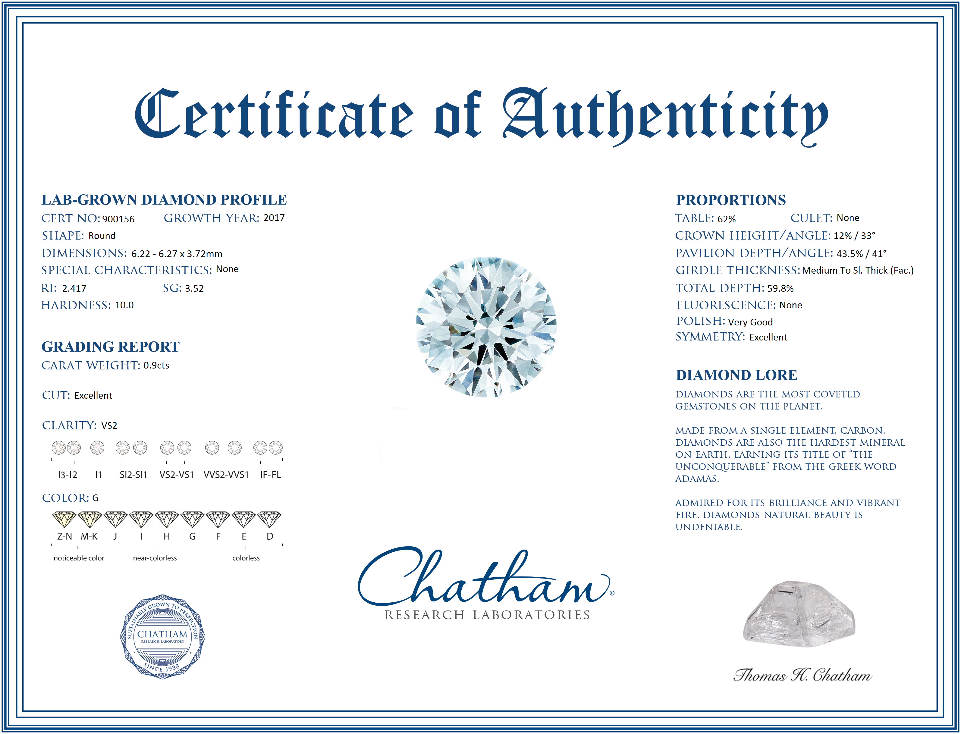 Chatham’s lab-grown diamonds are just as pure and brilliant as your future together. Only Chatham offers you a diamond that grew while your love for each other was growing, so you can mark this special moment in your life forever.  Each lab-grown diamond comes with a Certificate of Authenticity & Grading Report that includes your diamond’s Growth Year. And because all of our gorgeous Chatham diamonds are grown in a laboratory, they are never mined, so the earth stays beautiful too.