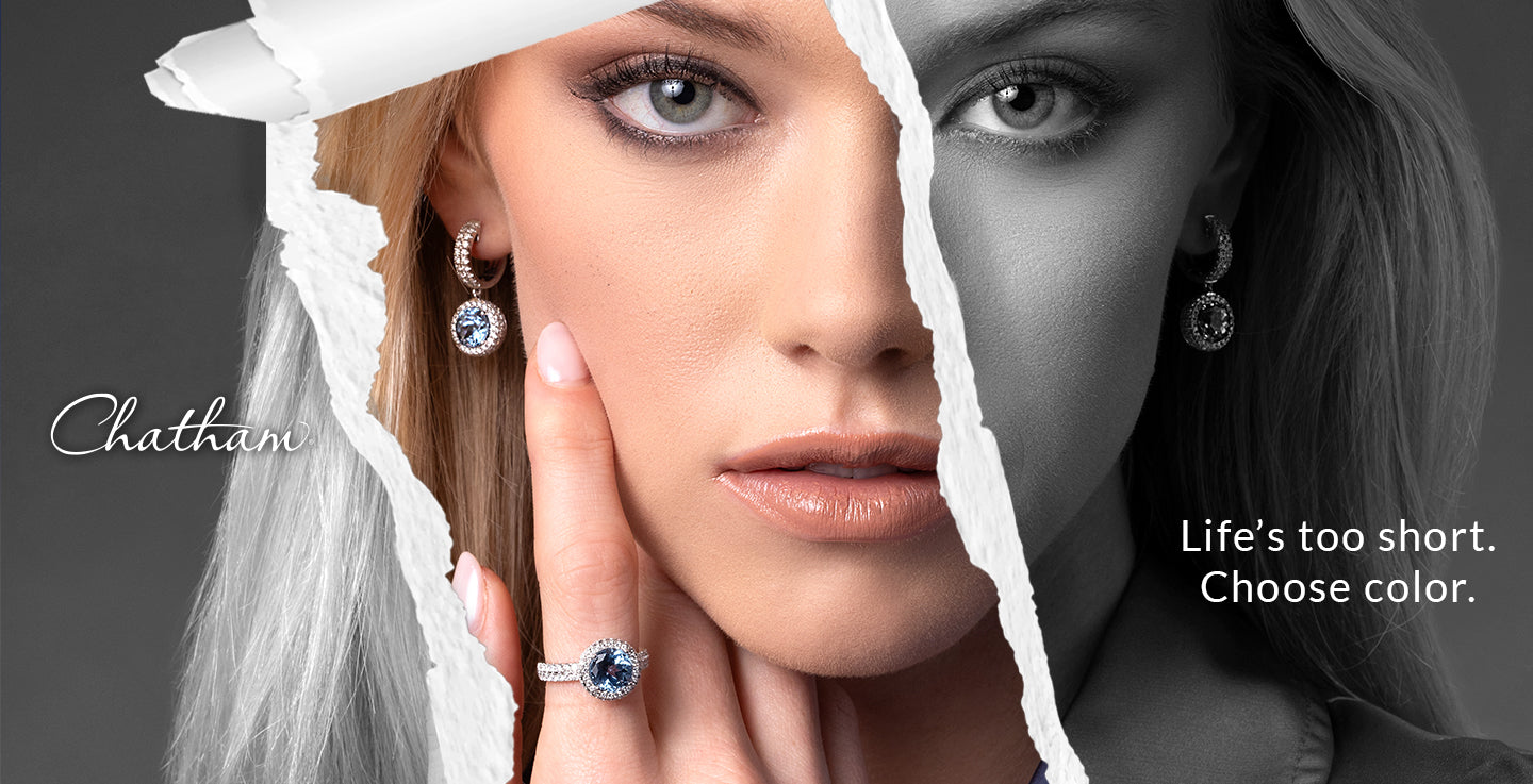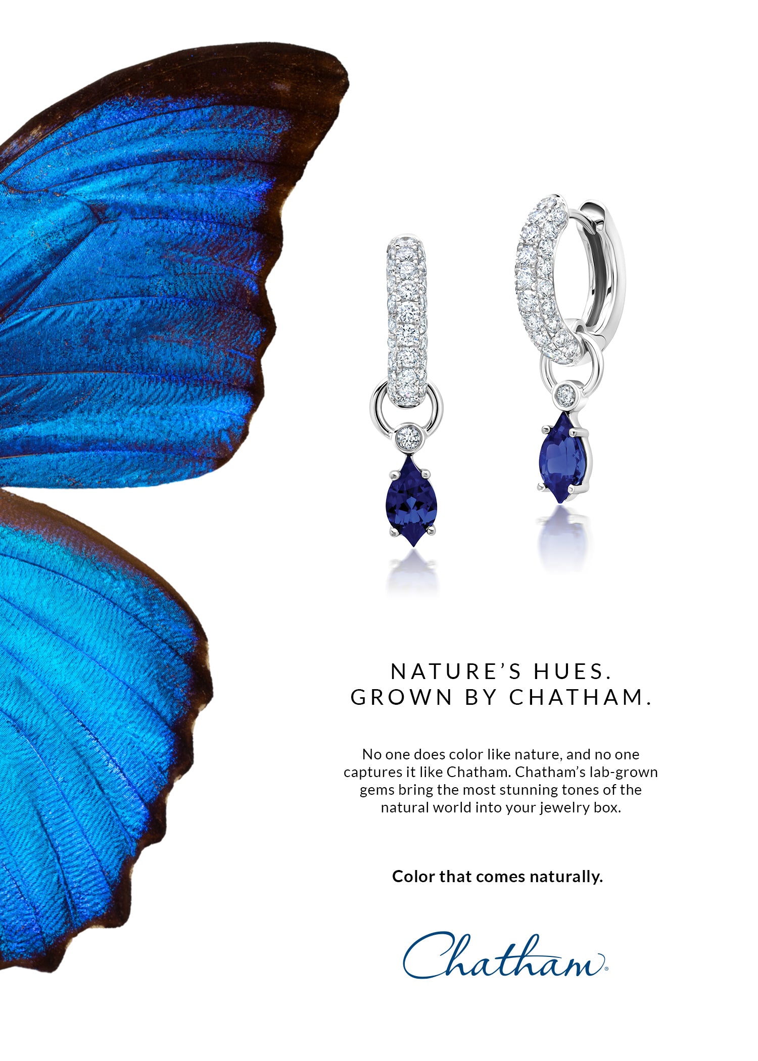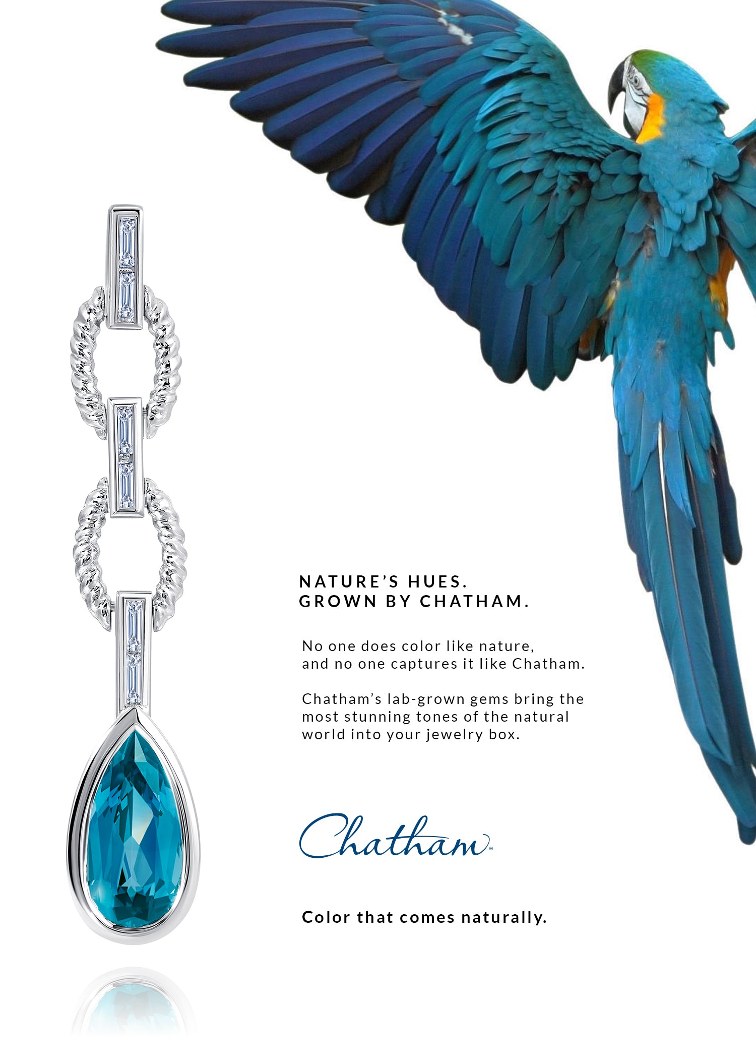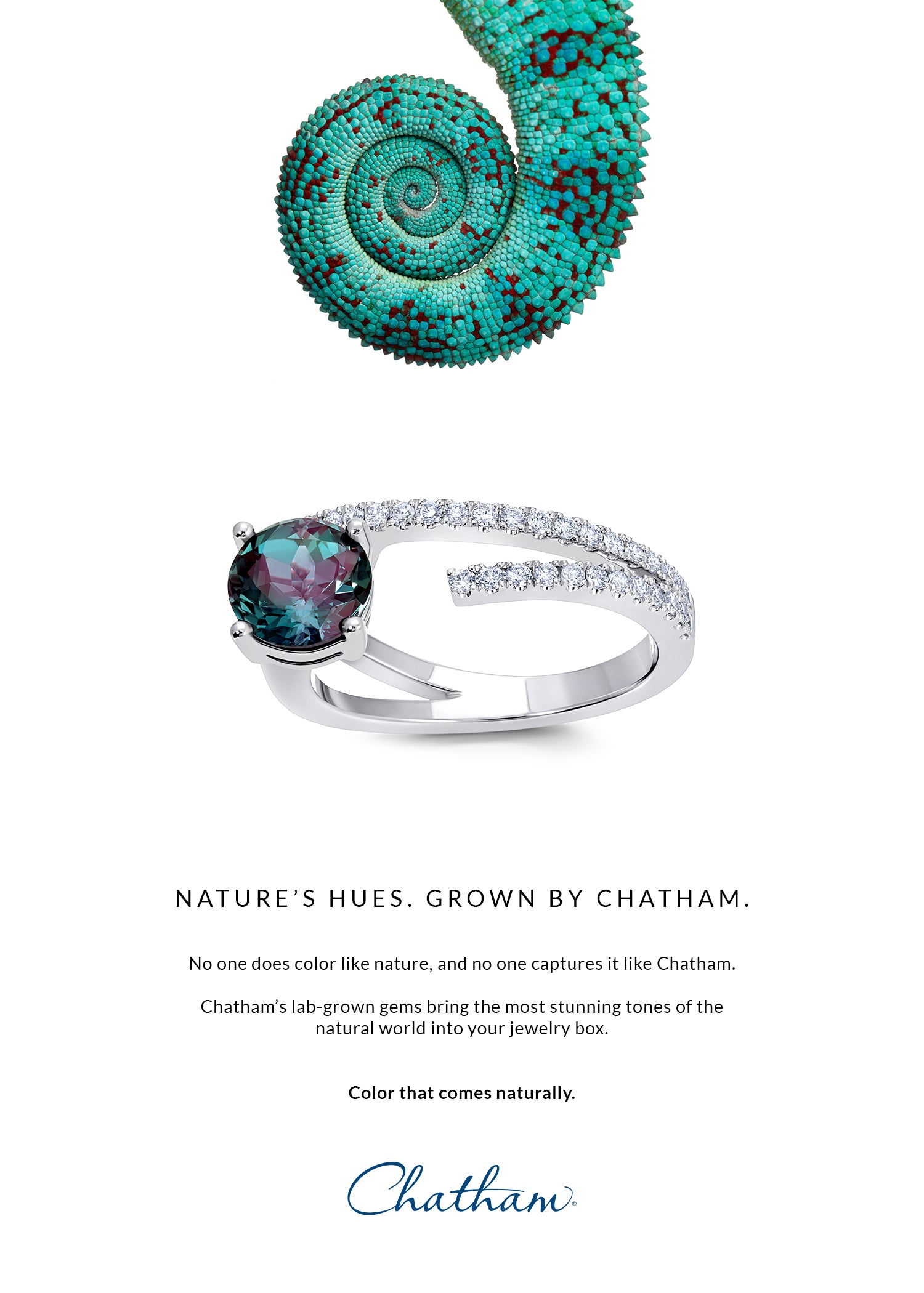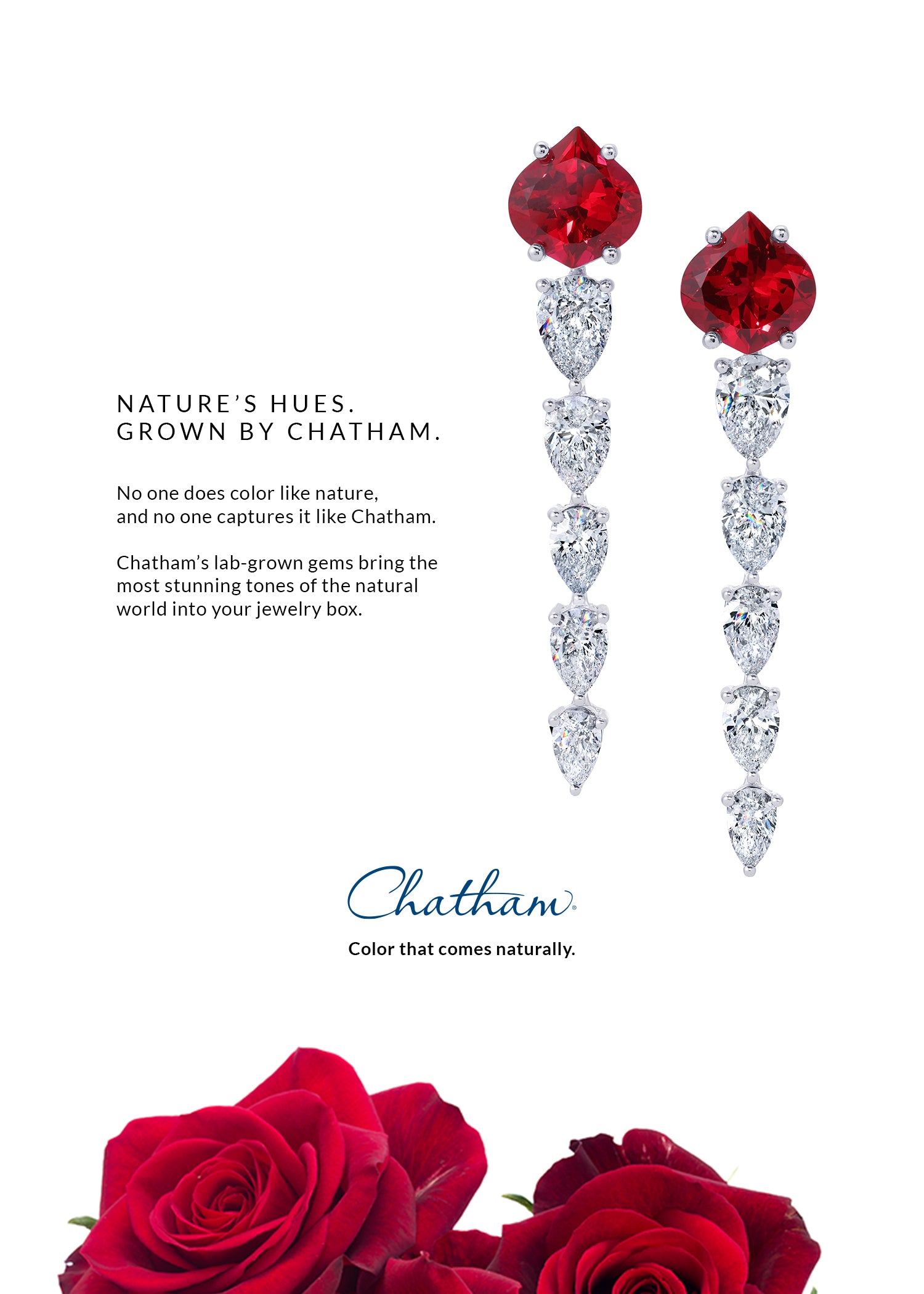 Ad copy: Nature's hues. Grown by Chatham. No one does color like nature, and no one captures it like Chatham. Chatham's lab-grown gems bring the most stunning tones of the natural world to your jewelry box.
