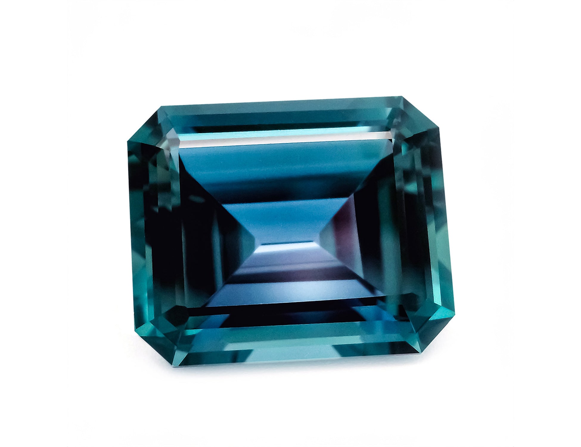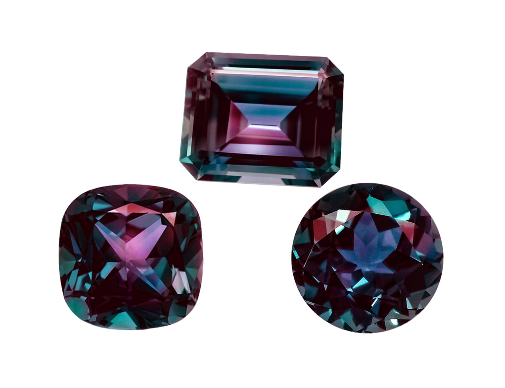 Chatham lab-grown alexandrite is a transparent stone that shifts from a bluish teal in daylight to a reddish purple under incandescent lighting.